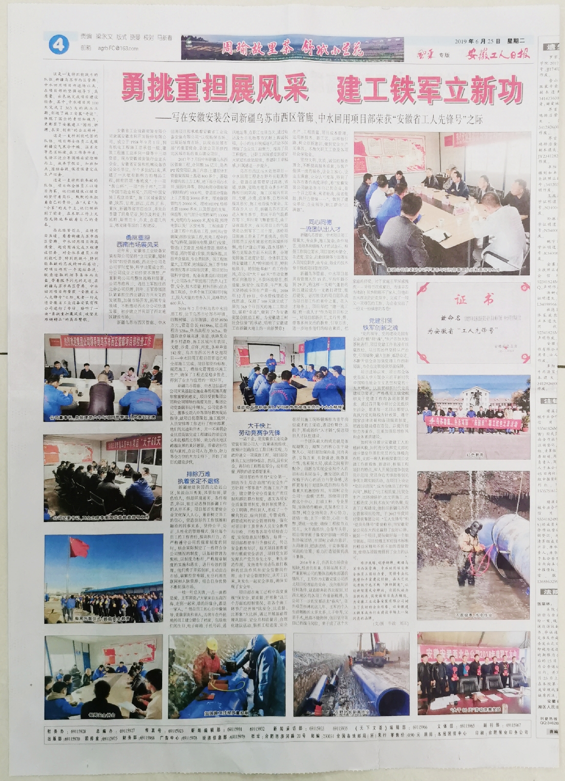 先進(jìn)典型是時(shí)代精神的標(biāo)桿,典型事跡報(bào)道是擴(kuò)大傳播力的有效法寶。近日,《安徽工人日?qǐng)?bào)》在風(fēng)采專版的顯著位置以《勇挑重?fù)?dān)展風(fēng)采,建工鐵軍立新功》為題刊發(fā)整版專題報(bào)道,記述安徽安裝新疆烏蘇市西區(qū)管廊、中水回用項(xiàng)目部榮獲“安徽省工人先鋒號(hào)”的典型事跡以及項(xiàng)目部團(tuán)隊(duì)的幕后故事。