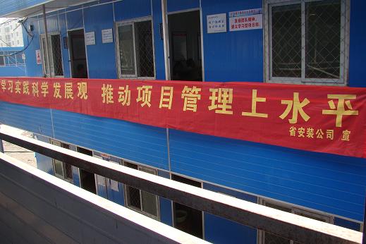 省政務(wù)服務(wù)中心及綜合樓和合肥中心醫(yī)院項(xiàng)目屬省、市重點(diǎn)工程之一。由多家大中型施工企業(yè)共同承建。我公司承擔(dān)的安裝工作量分別在1582萬和2800萬以上,是具有相當(dāng)規(guī)模和社會(huì)影響的工程項(xiàng)目。合肥項(xiàng)目黨支部在開展第二批實(shí)踐科學(xué)發(fā)展觀活動(dòng)中,因地制宜地開展宣傳活動(dòng)。分別在這兩個(gè)項(xiàng)目施工現(xiàn)場懸掛了《深入開展學(xué)習(xí)實(shí)踐科學(xué)發(fā)展觀活動(dòng)》和《學(xué)習(xí)實(shí)踐科學(xué)發(fā)展觀推動(dòng)項(xiàng)目管理上水平》的橫幅標(biāo)語。目前是整個(gè)施工現(xiàn)場開展學(xué)習(xí)實(shí)踐科學(xué)發(fā)展觀活動(dòng)中唯一在現(xiàn)場宣傳的一家施工企業(yè)。