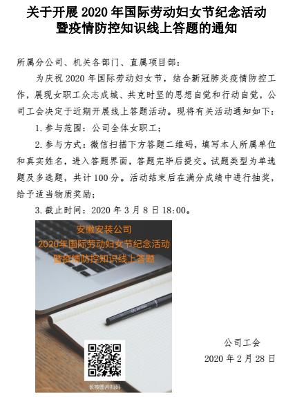 鑒于當前新冠肺炎疫情防控特殊時期,本著不聚集、少聚集的原則,安徽安裝公司工會組織全公司八十多名女職工參加了疫情防控和《婦女權益保障法》等知識的學習,利用微信平臺開展了線上答題活動,活動一推出,廣大女職工立即響應,熱情高漲,對于不太清楚的問題,主動查閱相關資料,與身邊的同事討論,對模棱兩可的問題,仔細斟酌精確作答。通過此次答題活動,全公司范圍內再一次掀起宣傳疫情防控常識的熱潮,推動公司疫情防控工作的開展,也進一步普及了新時期下女職工的合法權益。答題活動結束后,對優(yōu)秀成績給予獎勵。