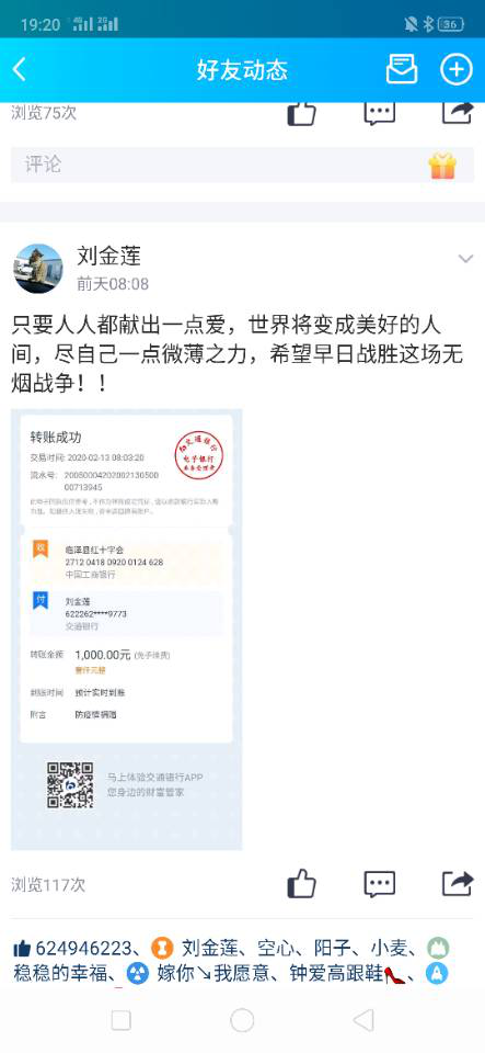 2020年2月13日,劉金蓮同志通過微信轉賬的方式轉給甘肅省臨澤縣紅十字會捐款人民幣1000元,然后她又主動聯(lián)系當?shù)丶t十字會工作人員要求擔當志愿者,但是因為客觀原因未被批準。