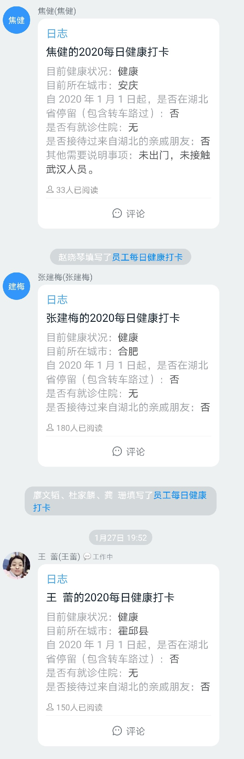 1月27日(大年初三),公司下發(fā)《安徽安裝公司關于做好新型冠狀病毒肺炎疫情工作的防控措施》,全體員工每日在釘釘日志專項報告當日去向及身體狀況,各分公司、各部門認真做好登記,確保信息及時準確,時刻密切關注員工的身體健康狀況。