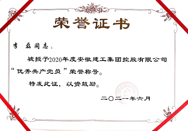 作為一名共產(chǎn)黨員,他處處以黨員的標(biāo)準(zhǔn)嚴格要求自己,聯(lián)系群眾和遵紀(jì)守法等各方面都較好的發(fā)揮著共產(chǎn)黨員的先鋒模范作用,得到領(lǐng)導(dǎo)和同事們的一致好評,榮獲2020年度“建工集團年度優(yōu)秀共產(chǎn)黨員”稱號。