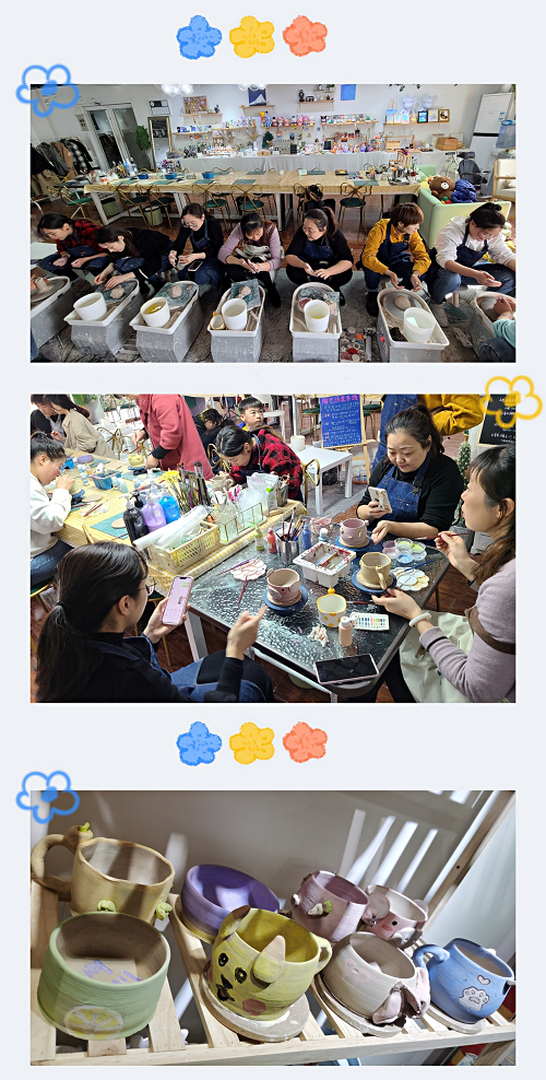 活動開始,大家一起參觀了各種各樣、富有特色的陶藝作品,使大家對“陶藝”產(chǎn)生了濃厚的興趣。首先陶藝老師為大家講解了制作過程以及注意事項,并演示了捏壓、拉胚、修胚、上色等制作陶藝的步驟。在老師的精心指導下,大家先從一塊無固定形狀的土坯泥塊開始,進行練泥、拉坯,只見放置在轉盤中心的泥團,隨手法的屈伸收放,不同形狀的杯子在大家的手中被創(chuàng)造出來。隨后大家用專用顏料在陶體上畫上自己心儀的圖案和彩繪,不一會兒,陶泥像被賦予了新的生命一般,一朵朵花,一只只小動物都躍然于陶藝素胚杯上,原本樸素的陶藝作品頓時活靈活現(xiàn)。最終一件件獨具匠心的陶藝作品,展現(xiàn)在大家面前,大家都十分期待早日拿到經(jīng)過上釉和燒制后親手制作的作品。