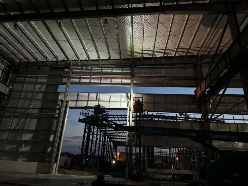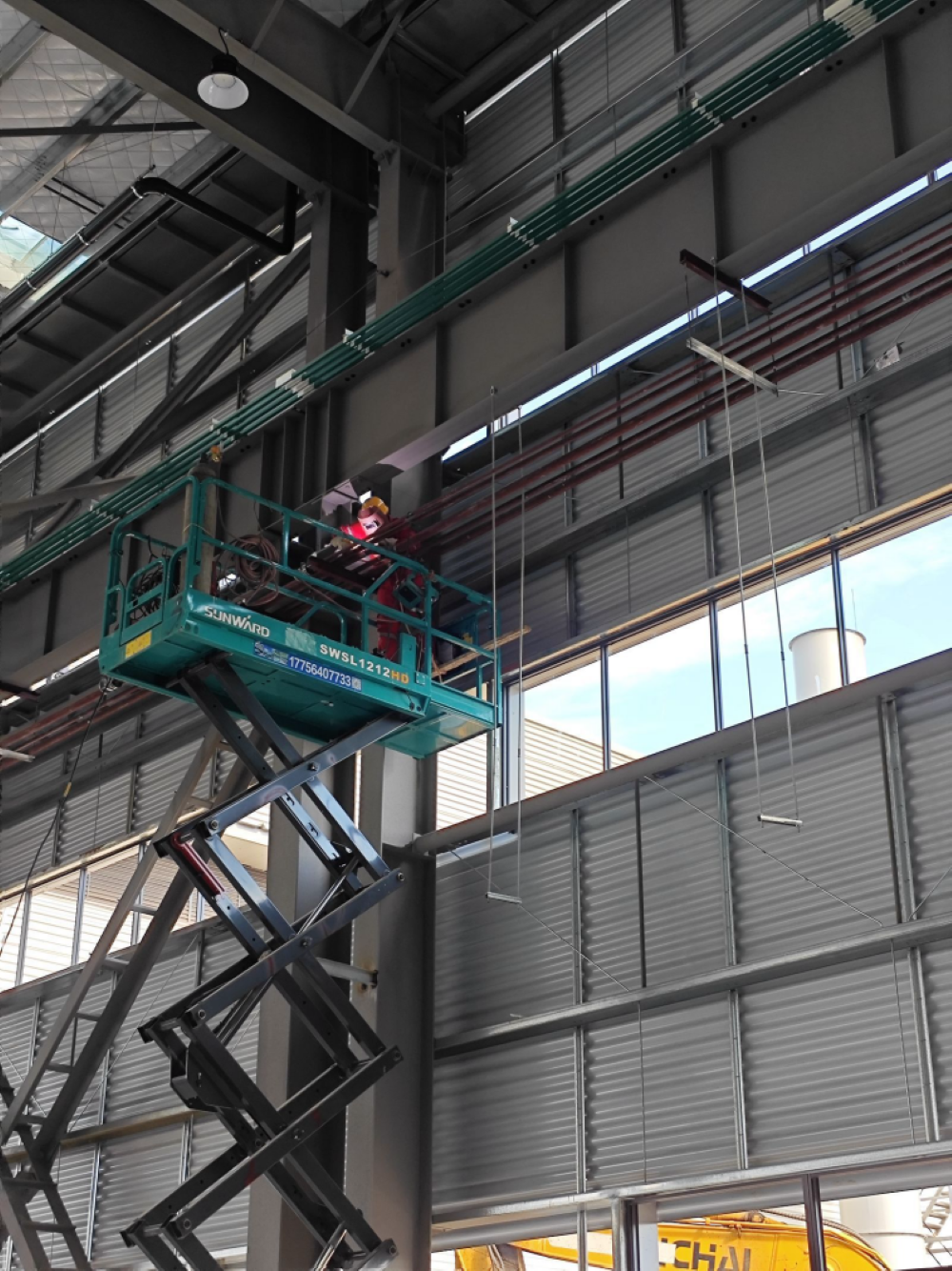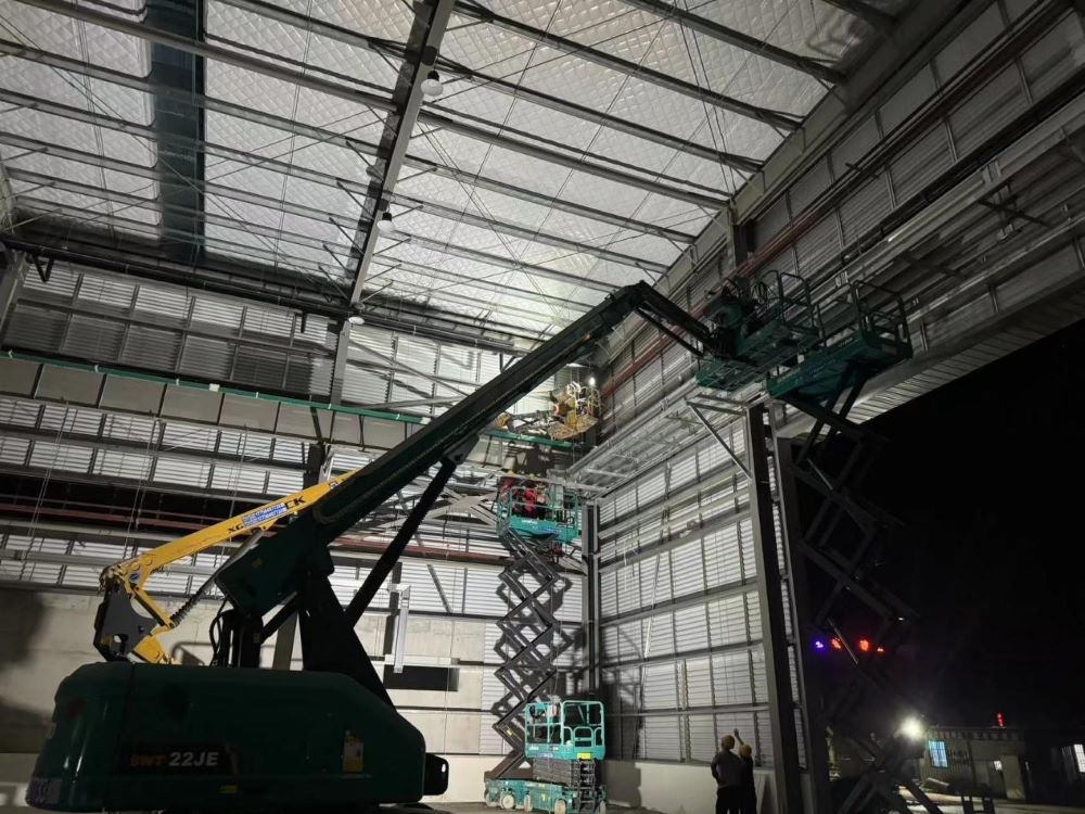 建工安裝合肥分公司施工內(nèi)容涉及2#重鋼車間主次構(gòu)安裝、圍護系統(tǒng)、門窗、防火涂料、通風氣樓和機電安裝工程(裝飾裝修、工藝管線、消防、給排水、電氣、通風空調(diào)等)。為保質(zhì)保量完成施工任務,分公司派駐分管領(lǐng)導現(xiàn)場駐點,項目管理團隊日夜跟進,施工人數(shù)達到100多人,曲臂車、登高車等各種現(xiàn)場施工機械達60余輛。本項目留給機電安裝工期緊任務重,項目全體人員日夜奮戰(zhàn),最終刷新15日大面完工耀眼戰(zhàn)績,為基地順利投產(chǎn)奠定堅實基礎(chǔ)。