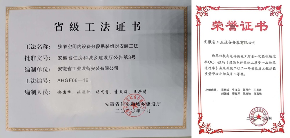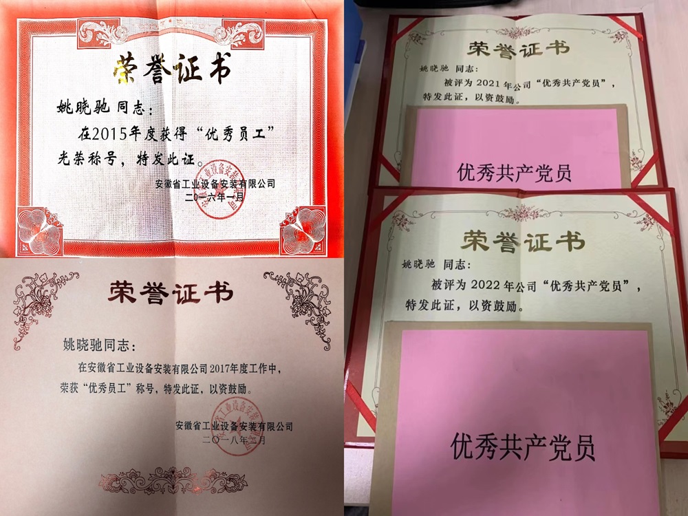 在繁忙的工作之余,姚曉馳對專業(yè)知識的探索與熱愛從未有片刻停歇。他仿若一位求知若渴的行者,積極主動(dòng)地在知識的海洋中破浪前行,持續(xù)拓寬并深化自身的知識體系。他參與研發(fā)的《狹窄空間內(nèi)設(shè)備分段吊裝組對安裝工法》成功榮獲安徽省住房和城鄉(xiāng)建設(shè)廳頒發(fā)的省級工法稱號,《提高電伴熱施工質(zhì)量一次驗(yàn)收通過率》也榮獲了安徽省工程建設(shè)質(zhì)量管理小組成果三等獎(jiǎng)。