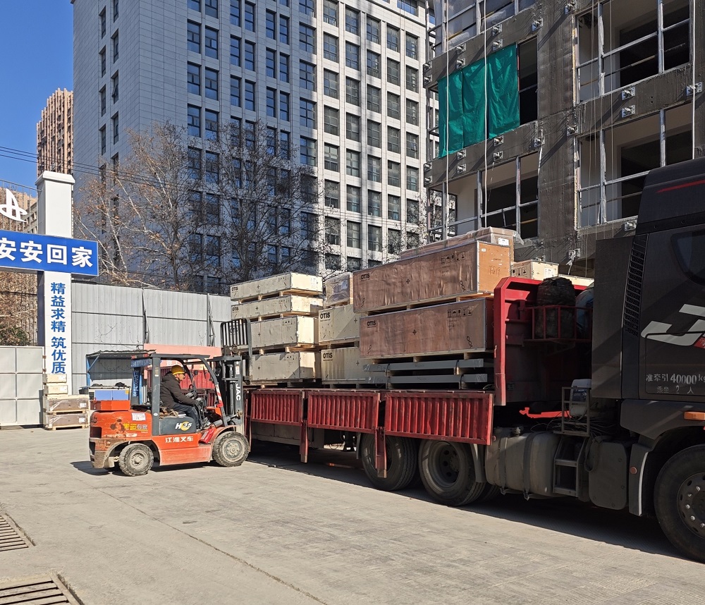 分公司商機廠租賃住房項目電梯到貨,現(xiàn)場施工人員正在準備卸貨