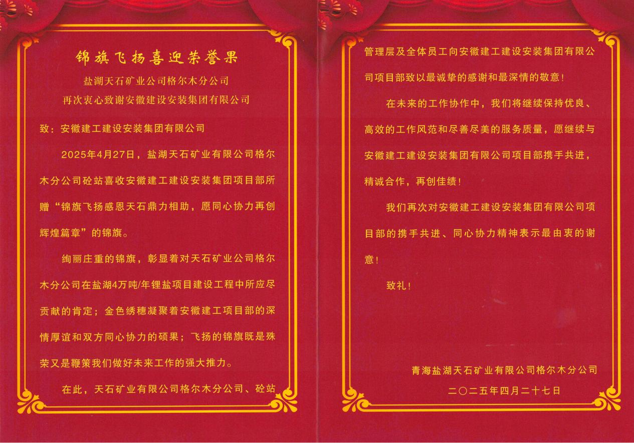 信中,青海鹽湖天石礦業(yè)有限公司格爾木分公司對(duì)建工安裝項(xiàng)目部此前慰問砼站全體員工致以最誠摯的感謝,愿繼續(xù)與建工安裝項(xiàng)目部攜手共進(jìn)、精誠合作、再創(chuàng)佳績!這封感謝信不僅是對(duì)項(xiàng)目部過往成績的肯定,更是一份振奮人心的激勵(lì)。建工安裝將繼續(xù)保持高昂斗志和嚴(yán)謹(jǐn)態(tài)度,加強(qiáng)與相關(guān)單位溝通協(xié)作,強(qiáng)化項(xiàng)目管理,確保項(xiàng)目按期、高質(zhì)量交付,為打造世界級(jí)鹽湖提鋰產(chǎn)業(yè)基地貢獻(xiàn)力量!