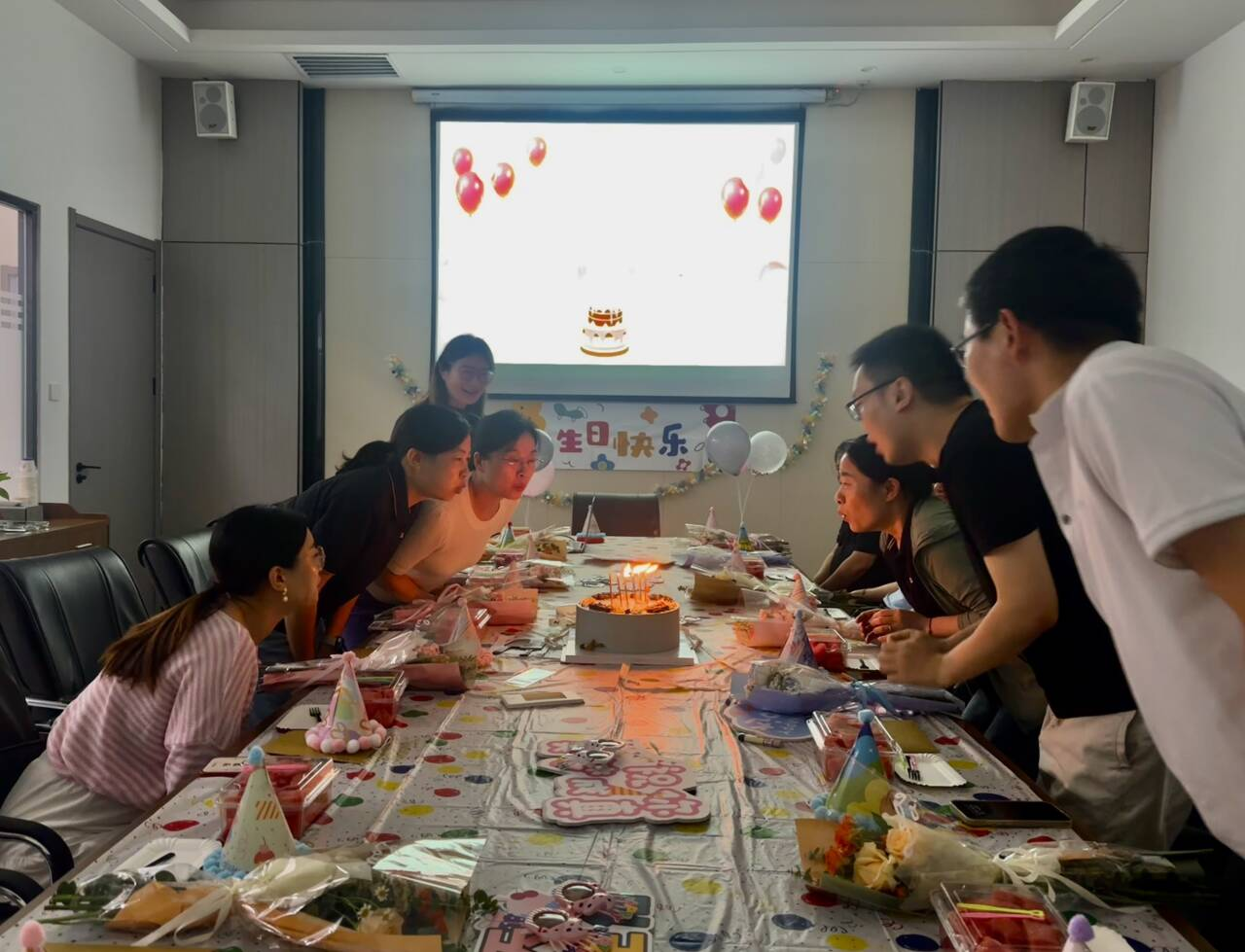 下午5點,隨著三季度“壽星”們笑容滿面地陸續(xù)來到會議室,生日會的溫馨序曲正式奏響——工會工作人員為每位到場的“壽星”遞上印有手寫祝福的生日賀卡,隨著“祝你生日快樂···”音樂響起,大家圍在一起吹蠟燭、吃蛋糕、送生日祝福,現場氣氛熱烈,充滿了歡聲笑語。